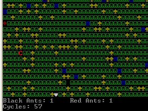 This ant simulator tracks two ant colonies. The ants must avoid poison and gather food and water. Ants on succesful trips return to the colony with a record of their movements. Ants leaving the colony attempt to duplicate past successful trips.